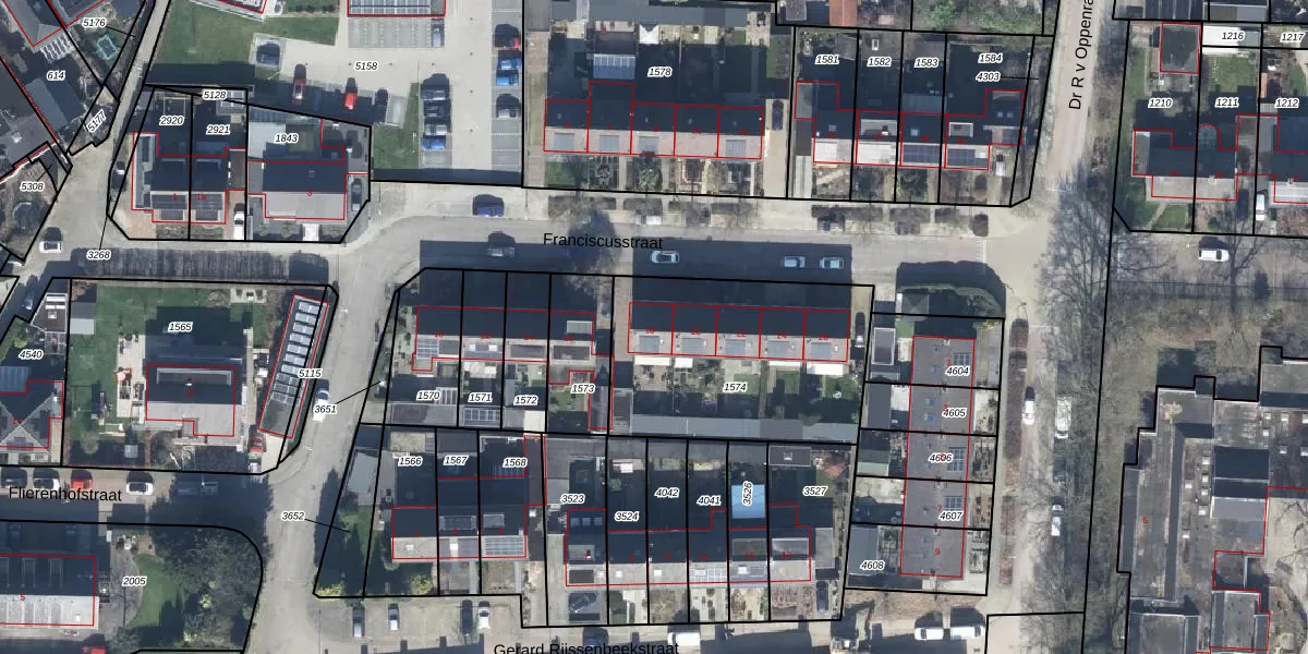 Het perceel waarop Franciscusstraat 18 staat heeft een oppervlakte van 965 m². Dit is een groot perceel. De perceeloppervlakte wordt geregistreerd door het Kadaster. Gedetailleerde informatie over de maten van dit perceel kunt u vinden in het rapport Kadastrale kaart met maatvoering van Franciscusstraat 18.