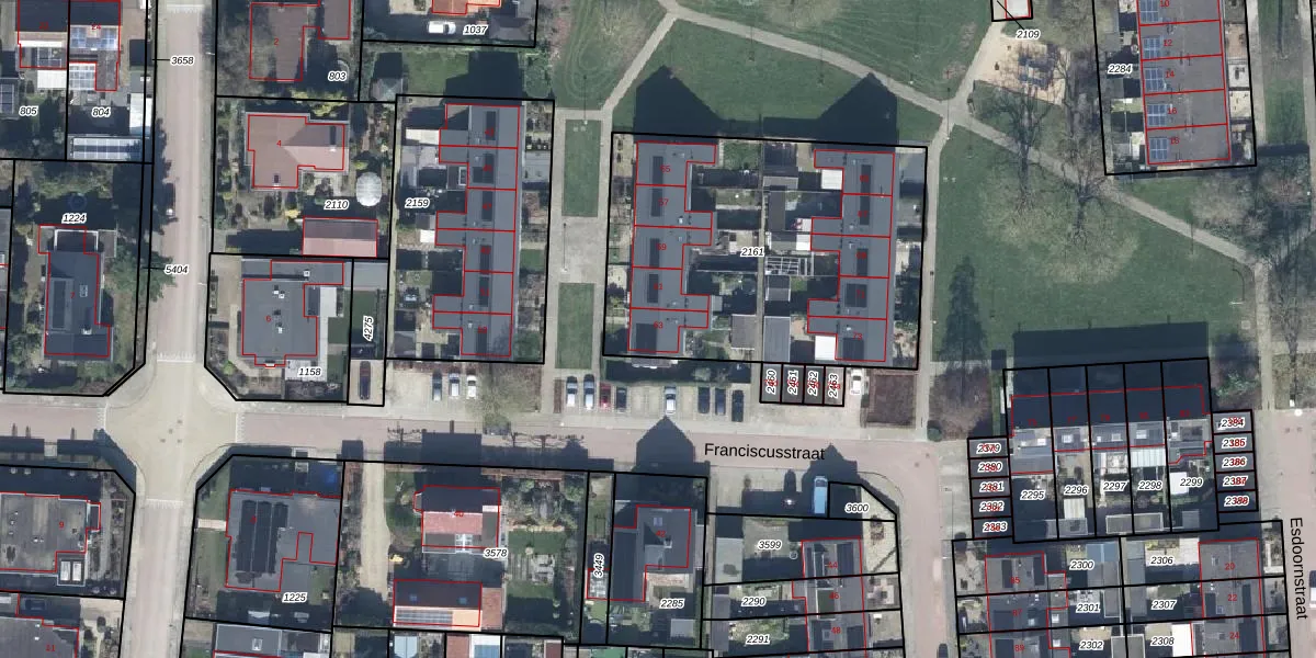 Het perceel waarop Franciscusstraat 63 staat heeft een oppervlakte van 1630 m². Dit is een zeer groot perceel. De perceeloppervlakte wordt geregistreerd door het Kadaster. Gedetailleerde informatie over de maten van dit perceel kunt u vinden in het rapport Kadastrale kaart met maatvoering van Franciscusstraat 63.