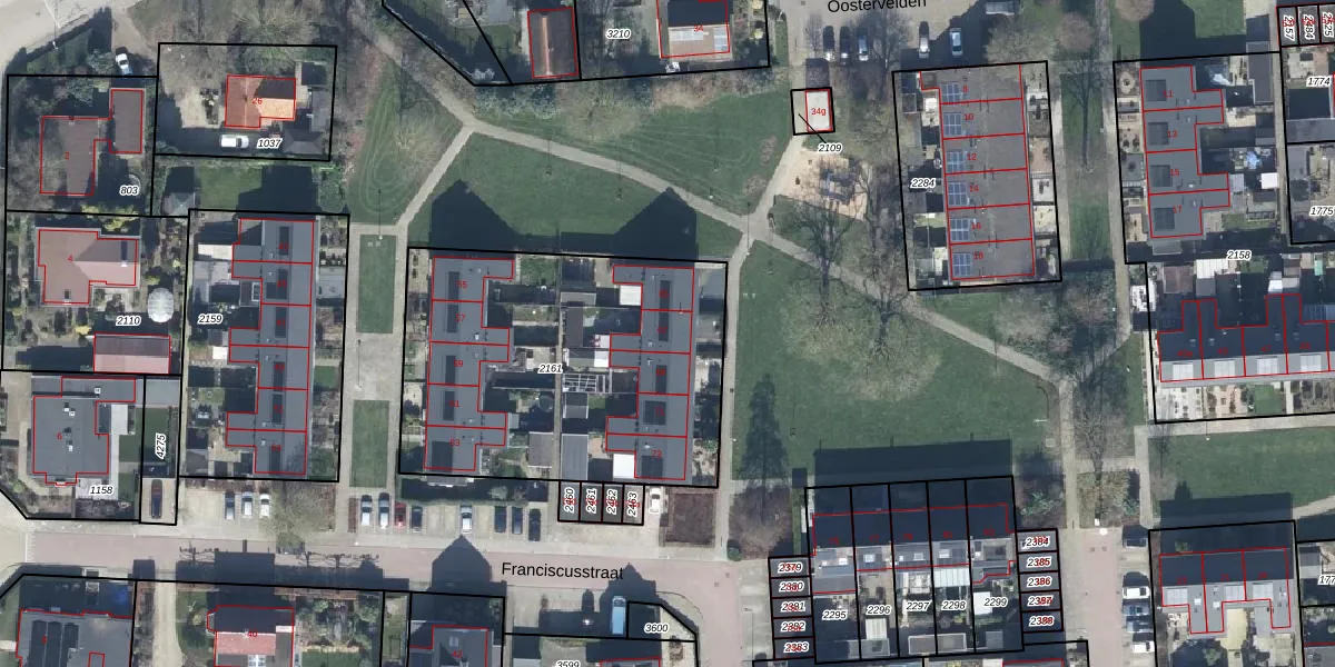 Het perceel waarop Franciscusstraat 67 staat heeft een oppervlakte van 1630 m². Dit is een zeer groot perceel. De perceeloppervlakte wordt geregistreerd door het Kadaster. Gedetailleerde informatie over de maten van dit perceel kunt u vinden in het rapport Kadastrale kaart met maatvoering van Franciscusstraat 67.