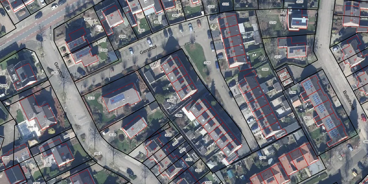 Het perceel waarop Gersthof 28 staat heeft een oppervlakte van 1840 m². Dit is een zeer groot perceel. De perceeloppervlakte wordt geregistreerd door het Kadaster. Gedetailleerde informatie over de maten van dit perceel kunt u vinden in het rapport Kadastrale kaart met maatvoering van Gersthof 28.