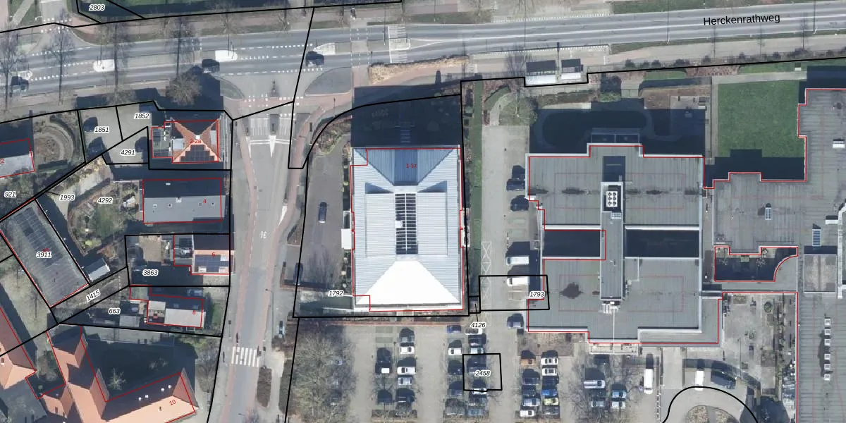 Het perceel waarop Herckenrathweg 1-x staat heeft een oppervlakte van 1875 m². Dit is een zeer groot perceel. De perceeloppervlakte wordt geregistreerd door het Kadaster. Gedetailleerde informatie over de maten van dit perceel kunt u vinden in het rapport Kadastrale kaart met maatvoering van Herckenrathweg 1-x.