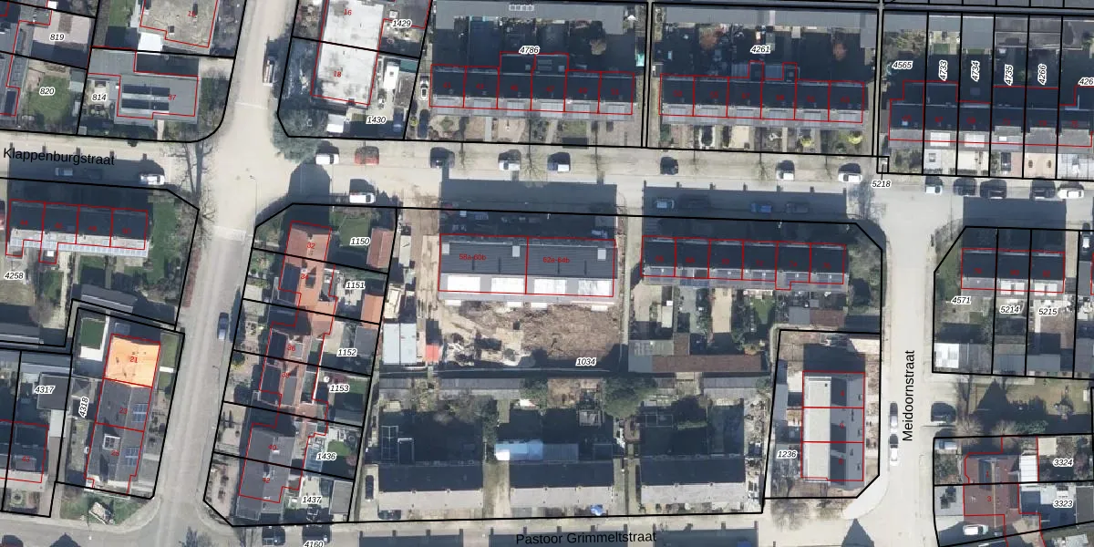 Het perceel waarop Klappenburgstraat 62-b staat heeft een oppervlakte van 4495 m². Dit is een zeer groot perceel. De perceeloppervlakte wordt geregistreerd door het Kadaster. Gedetailleerde informatie over de maten van dit perceel kunt u vinden in het rapport Kadastrale kaart met maatvoering van Klappenburgstraat 62-b.