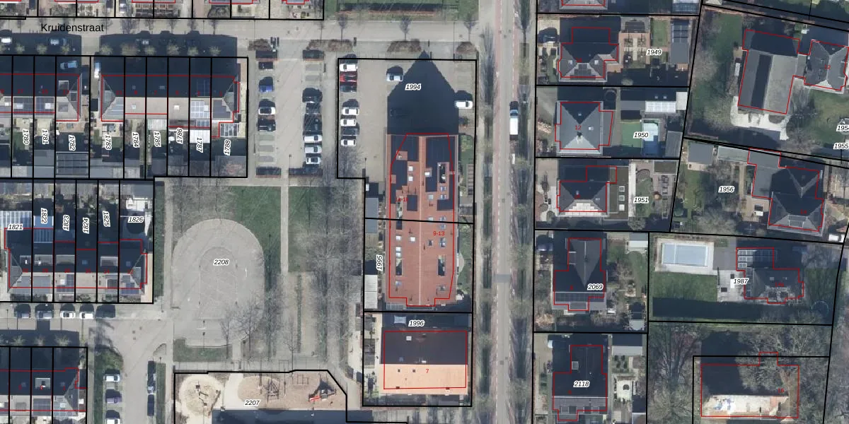 Het perceel waarop Kruidenstraat 1-f staat heeft een oppervlakte van 1168 m². Dit is een zeer groot perceel. De perceeloppervlakte wordt geregistreerd door het Kadaster. Gedetailleerde informatie over de maten van dit perceel kunt u vinden in het rapport Kadastrale kaart met maatvoering van Kruidenstraat 1-f.