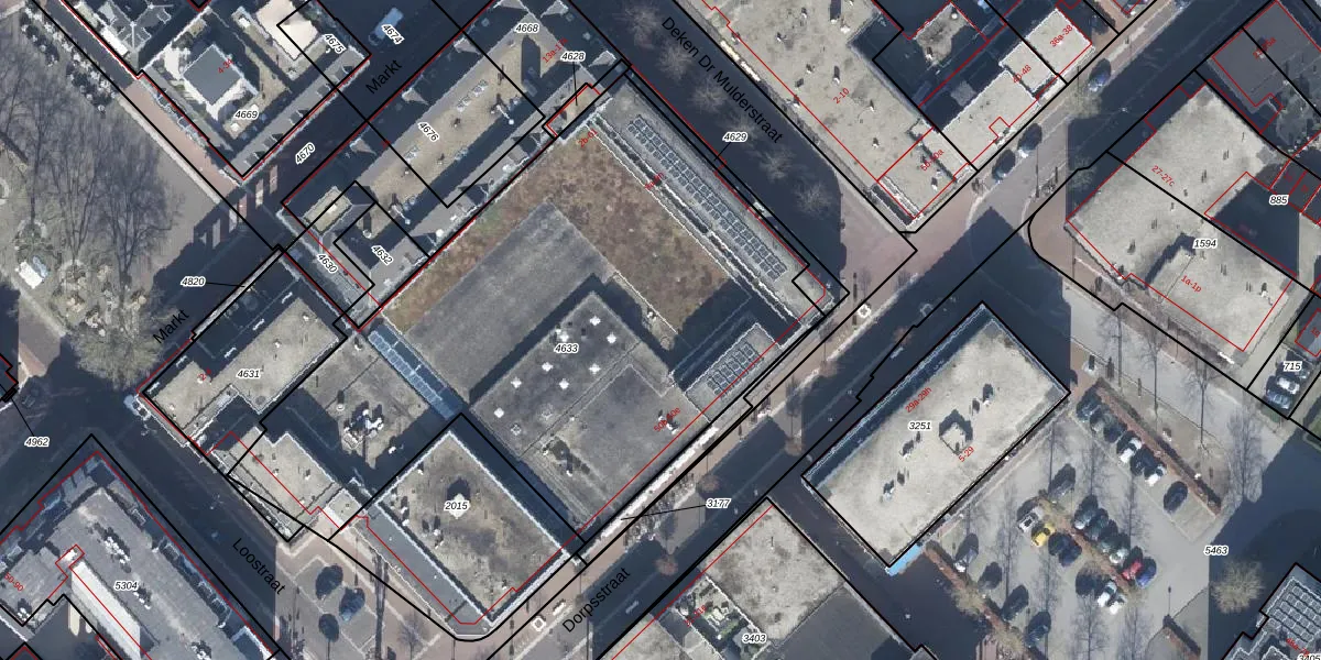 Het perceel waarop Markt 57 staat heeft een oppervlakte van 3140 m². Dit is een zeer groot perceel. De perceeloppervlakte wordt geregistreerd door het Kadaster. Gedetailleerde informatie over de maten van dit perceel kunt u vinden in het rapport Kadastrale kaart met maatvoering van Markt 57.