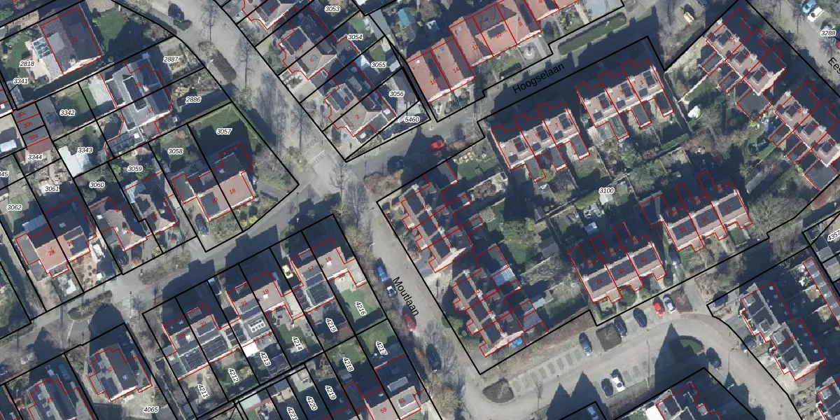 Het perceel waarop Moutlaan 56 staat heeft een oppervlakte van 5410 m². Dit is een zeer groot perceel. De perceeloppervlakte wordt geregistreerd door het Kadaster. Gedetailleerde informatie over de maten van dit perceel kunt u vinden in het rapport Kadastrale kaart met maatvoering van Moutlaan 56.