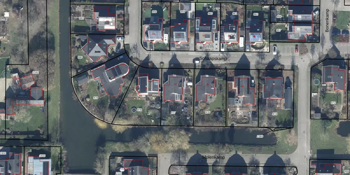 Het perceel waarop Schaapskamp 47 staat heeft een oppervlakte van 610 m². Dit is een groot perceel. De perceeloppervlakte wordt geregistreerd door het Kadaster. Gedetailleerde informatie over de maten van dit perceel kunt u vinden in het rapport Kadastrale kaart met maatvoering van Schaapskamp 47.