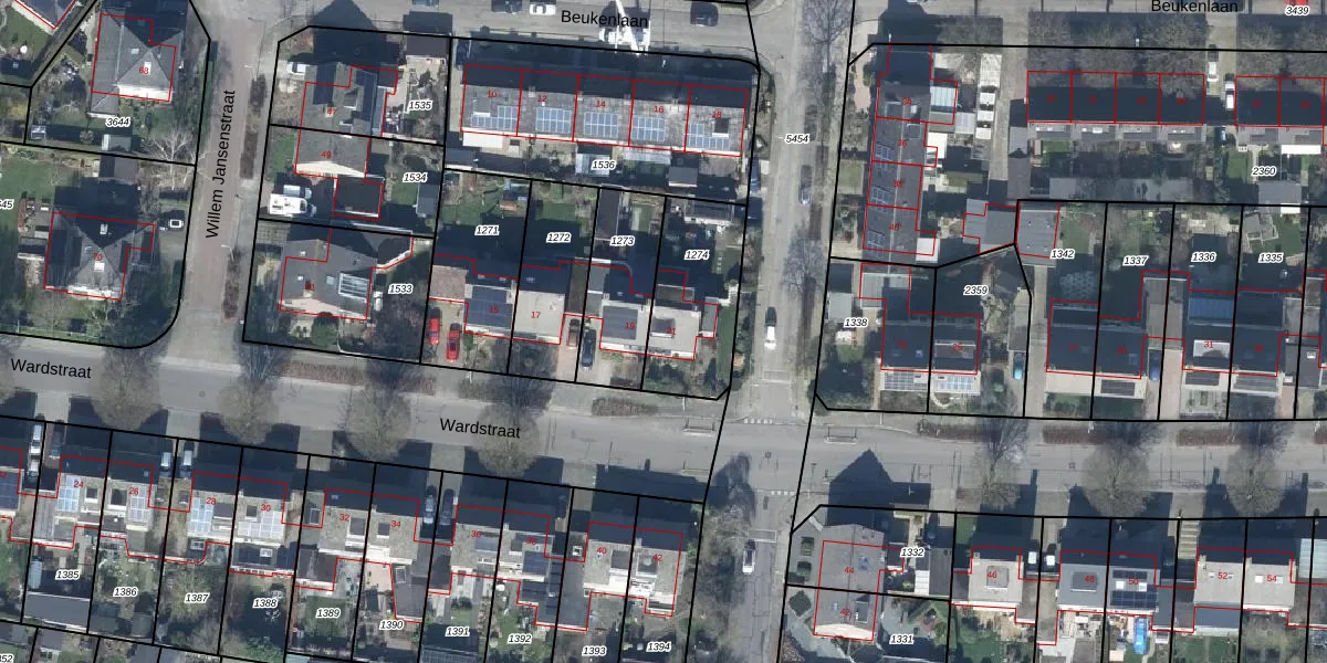 Het perceel waarop Wardstraat 21 staat heeft een oppervlakte van 374 m². Dit is een groot perceel. De perceeloppervlakte wordt geregistreerd door het Kadaster. Gedetailleerde informatie over de maten van dit perceel kunt u vinden in het rapport Kadastrale kaart met maatvoering van Wardstraat 21.
