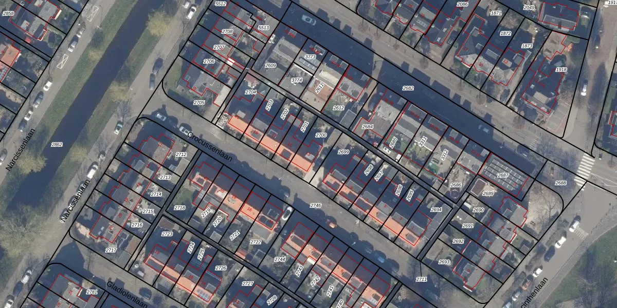 Gebruik de zoekbalk of klik op een perceel voor informatie over de adressen binnen dit perceel.
