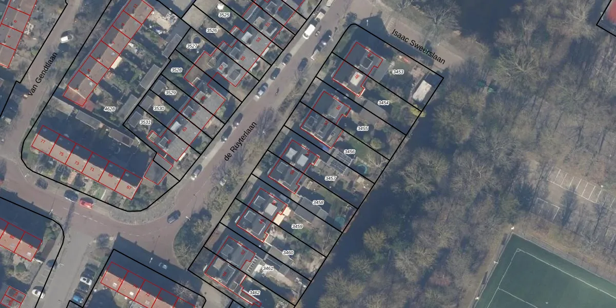 de Ruyterlaan 54 is gelegen op kadastraal perceel BNB00A3457. Deze kadastrale aanduiding is uniek en wordt gebruikt door het Kadaster om eigendomsrechten en andere zakelijke rechten vast te leggen. Het perceel maakt onderdeel uit van de kadastrale gemeente Bennebroek.