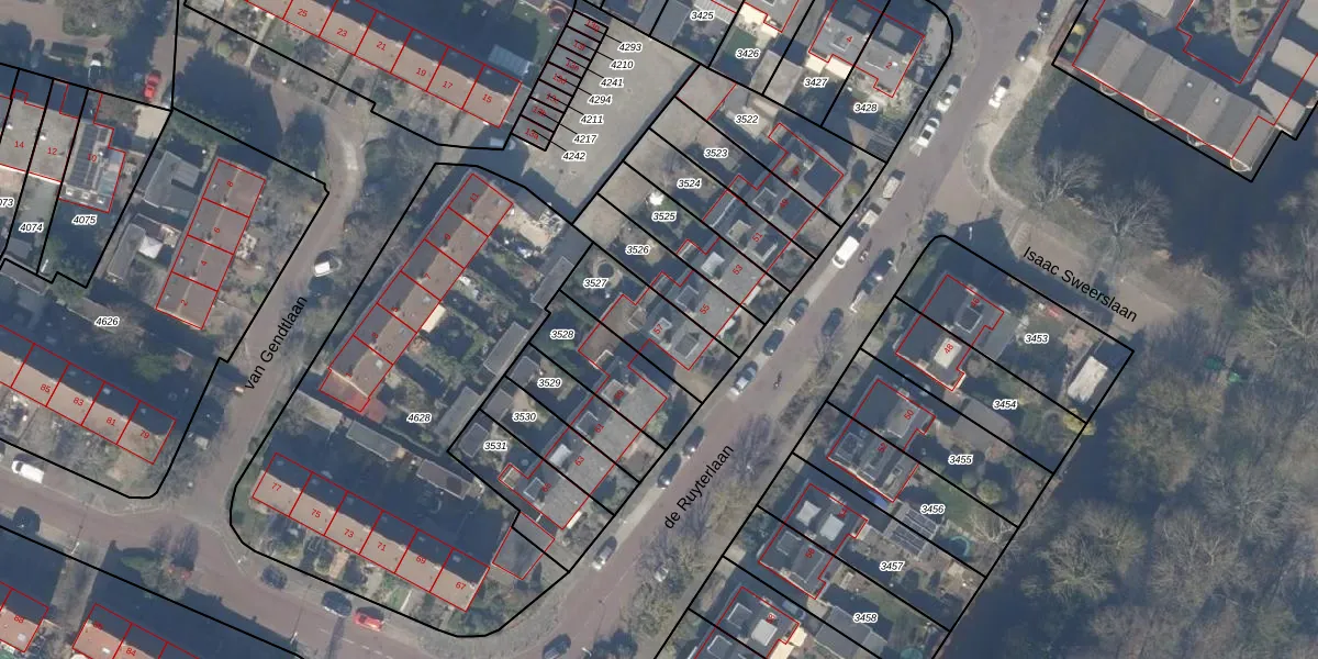 Het perceel waarop de Ruyterlaan 57 staat heeft een oppervlakte van 251 m². Dit is een middelgroot perceel. De perceeloppervlakte wordt geregistreerd door het Kadaster. Gedetailleerde informatie over de maten van dit perceel kunt u vinden in het rapport Kadastrale kaart met maatvoering van de Ruyterlaan 57.