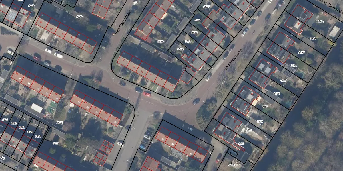 Het perceel waarop de Ruyterlaan 67 staat heeft een oppervlakte van 2136 m². Dit is een zeer groot perceel. De perceeloppervlakte wordt geregistreerd door het Kadaster. Gedetailleerde informatie over de maten van dit perceel kunt u vinden in het rapport Kadastrale kaart met maatvoering van de Ruyterlaan 67.