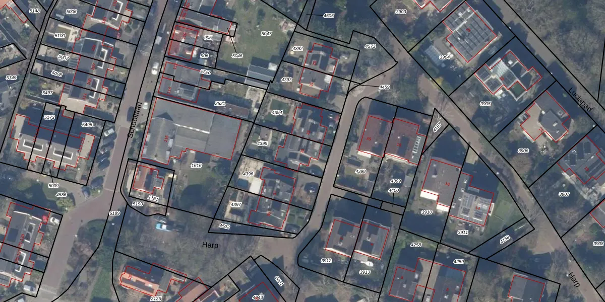 Het perceel waarop Harp 35 staat heeft een oppervlakte van 300 m². Dit is een groot perceel. De perceeloppervlakte wordt geregistreerd door het Kadaster. Gedetailleerde informatie over de maten van dit perceel kunt u vinden in het rapport Kadastrale kaart met maatvoering van Harp 35.