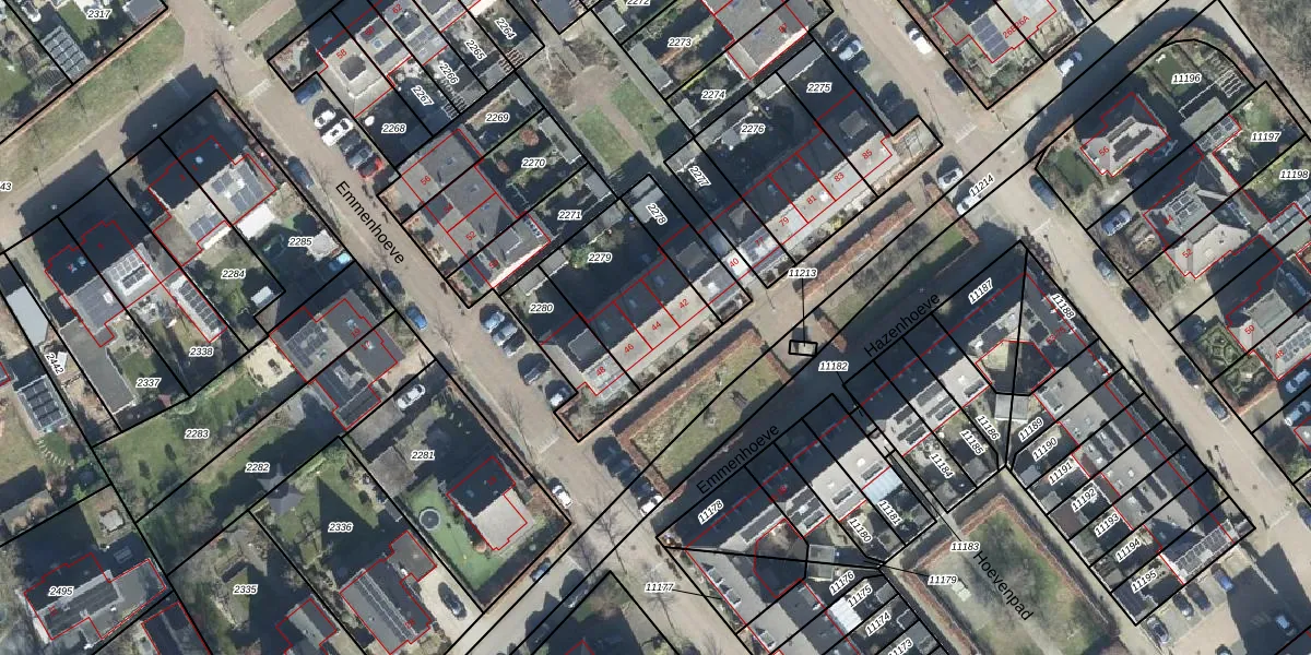 Het perceel waarop Emmenhoeve 44 staat heeft een oppervlakte van 405 m². Dit is een groot perceel. De perceeloppervlakte wordt geregistreerd door het Kadaster. Gedetailleerde informatie over de maten van dit perceel kunt u vinden in het rapport Kadastrale kaart met maatvoering van Emmenhoeve 44.