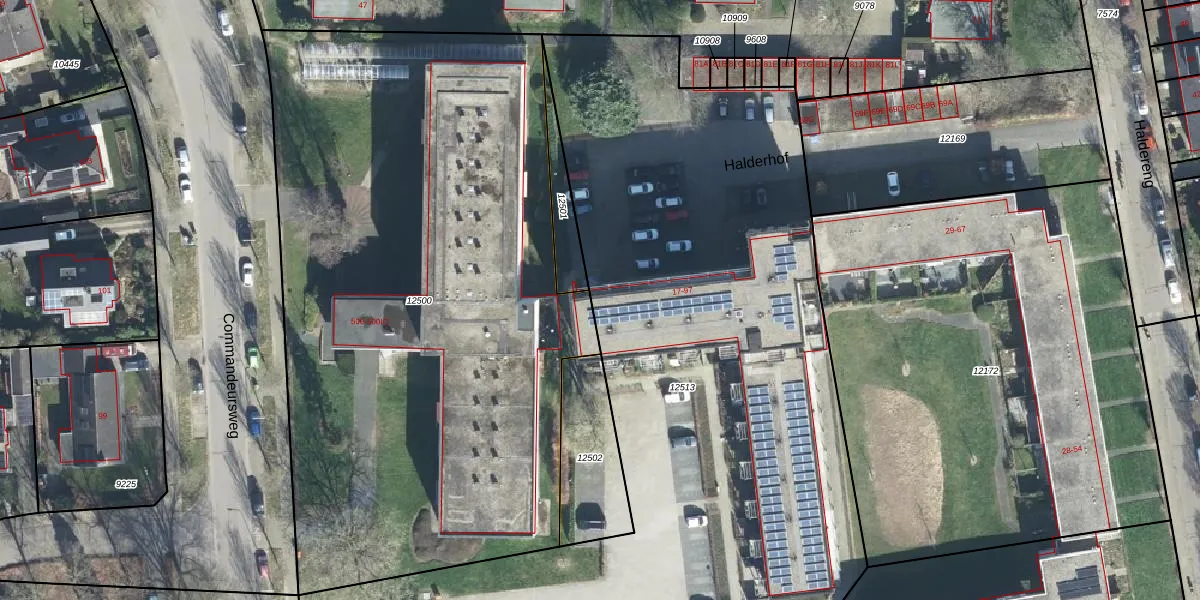 Het perceel waarop Halderhof 25 staat heeft een oppervlakte van 4448 m². Dit is een zeer groot perceel. De perceeloppervlakte wordt geregistreerd door het Kadaster. Gedetailleerde informatie over de maten van dit perceel kunt u vinden in het rapport Kadastrale kaart met maatvoering van Halderhof 25.
