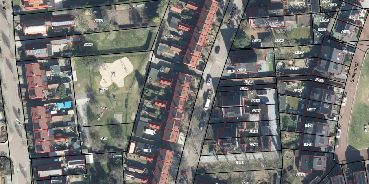 Het perceel waarop Laarweg 111 staat heeft een oppervlakte van 6355 m². Dit is een zeer groot perceel. De perceeloppervlakte wordt geregistreerd door het Kadaster. Gedetailleerde informatie over de maten van dit perceel kunt u vinden in het rapport Kadastrale kaart met maatvoering van Laarweg 111.