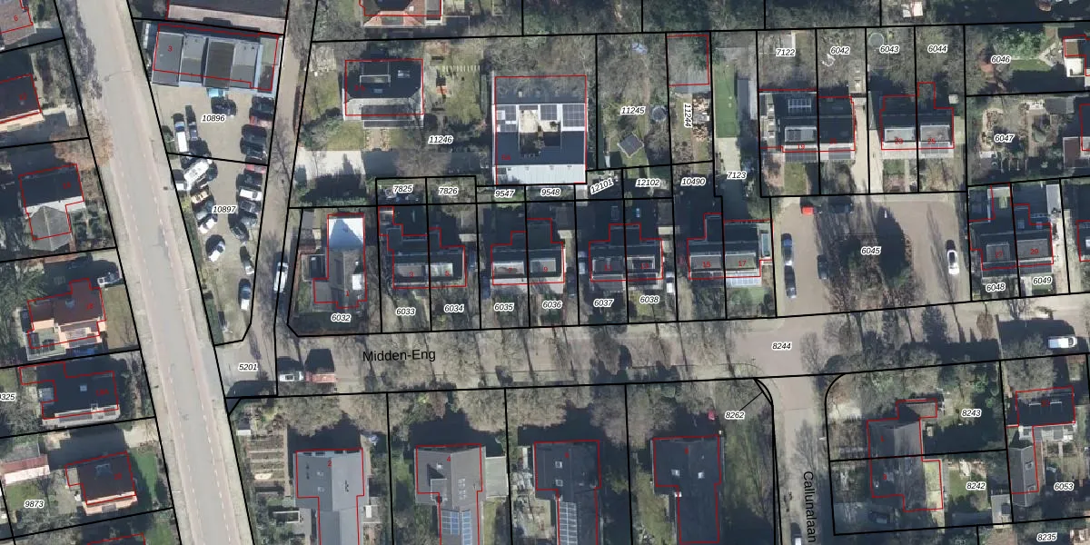 Midden-Eng 9 is gelegen op kadastraal perceel BNK01E6036. Deze kadastrale aanduiding is uniek en wordt gebruikt door het Kadaster om eigendomsrechten en andere zakelijke rechten vast te leggen. Het perceel maakt onderdeel uit van de kadastrale gemeente Bennekom.