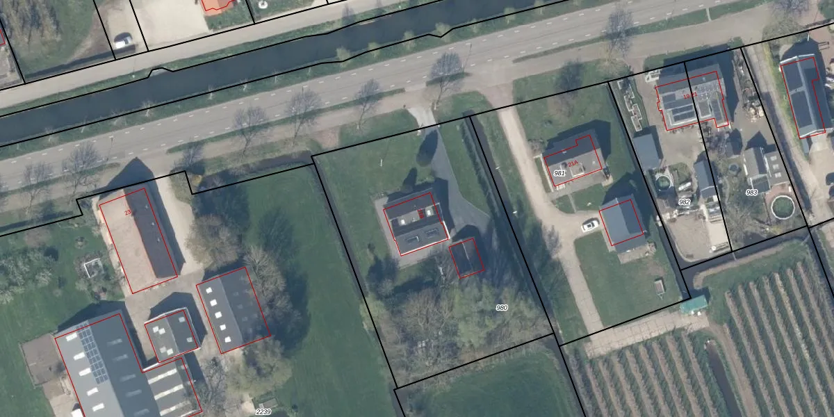 Het adres is gelegen op perceel 980 in de sectie E en de kadastrale gemeente Lopik. De kadastrale aanduiding is aldus LPK00-E-980. De gemiddelde perceelgrootte in Lopik is 1,1 ha. Dit perceel is kleiner: de perceeloppervlakte bedraagt 2260 m². Het grootste perceel in de kadastrale gemeente is 33,7 ha. Het kleinste perceel heeft een oppervlakte van 0 m². Er zijn geen andere adressen aanwezig op het perceel. De huidige grenzen van het perceel zijn digitaal in de Basisregistratie Kadaster (BRK) geregistreerd op 06-11-2025.