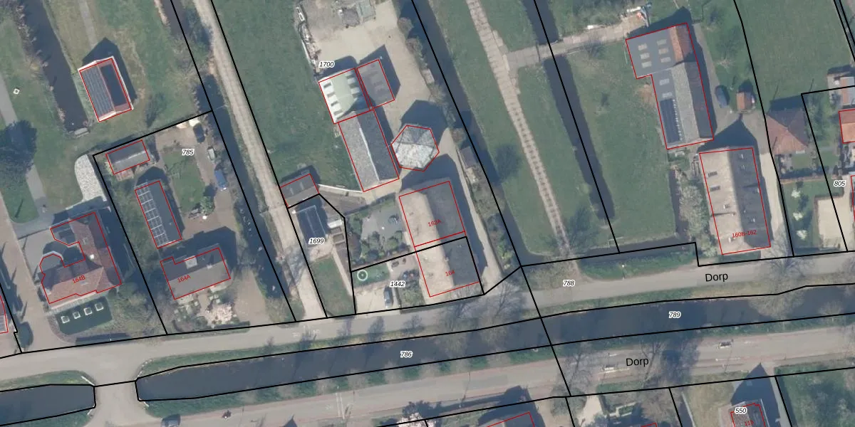 Het perceel waarop Dorp 162-A staat heeft een oppervlakte van 5037 m². Dit is een zeer groot perceel. De perceeloppervlakte wordt geregistreerd door het Kadaster. Gedetailleerde informatie over de maten van dit perceel kunt u vinden in het rapport Kadastrale kaart met maatvoering van Dorp 162-A.