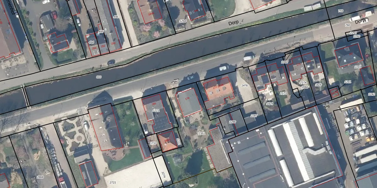 Het perceel waarop Dorp 179 staat heeft een oppervlakte van 1193 m². Dit is een zeer groot perceel. De perceeloppervlakte wordt geregistreerd door het Kadaster. Gedetailleerde informatie over de maten van dit perceel kunt u vinden in het rapport Kadastrale kaart met maatvoering van Dorp 179.