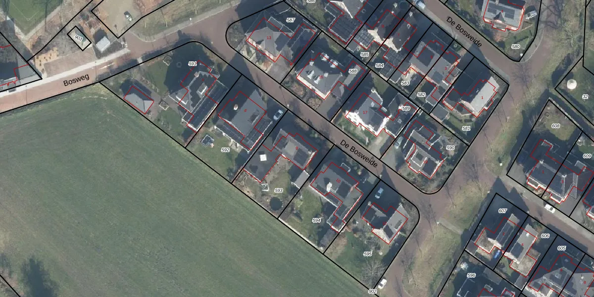 De Bosweide 8 is gelegen op kadastraal perceel DDN01L593. Deze kadastrale aanduiding is uniek en wordt gebruikt door het Kadaster om eigendomsrechten en andere zakelijke rechten vast te leggen. Het perceel maakt onderdeel uit van de kadastrale gemeente Ambt-Delden.