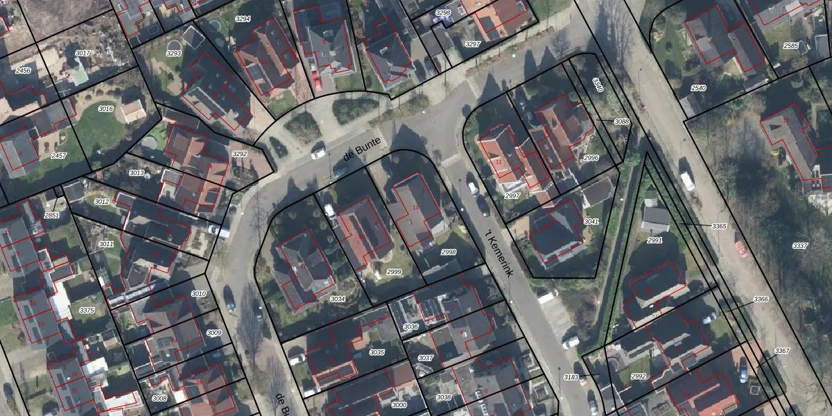 Het perceel waarop de Bunte 13 staat heeft een oppervlakte van 478 m². Dit is een groot perceel. De perceeloppervlakte wordt geregistreerd door het Kadaster. Gedetailleerde informatie over de maten van dit perceel kunt u vinden in het rapport Kadastrale kaart met maatvoering van de Bunte 13.