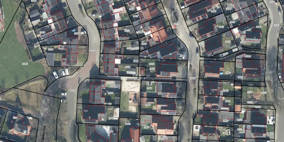 Het perceel waarop de Bunte 38 staat heeft een oppervlakte van 35 m². Dit is een klein perceel. De perceeloppervlakte wordt geregistreerd door het Kadaster. Gedetailleerde informatie over de maten van dit perceel kunt u vinden in het rapport Kadastrale kaart met maatvoering van de Bunte 38.
