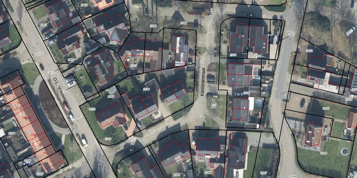 Kastanjestraat 9 is gelegen op kadastraal perceel DDN01D2538. Deze kadastrale aanduiding is uniek en wordt gebruikt door het Kadaster om eigendomsrechten en andere zakelijke rechten vast te leggen. Het perceel maakt onderdeel uit van de kadastrale gemeente Ambt-Delden.