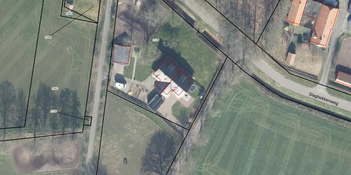 Slaghekkenweg 14-a is gelegen op kadastraal perceel DDN01C2139. Deze kadastrale aanduiding is uniek en wordt gebruikt door het Kadaster om eigendomsrechten en andere zakelijke rechten vast te leggen. Het perceel maakt onderdeel uit van de kadastrale gemeente Ambt-Delden.