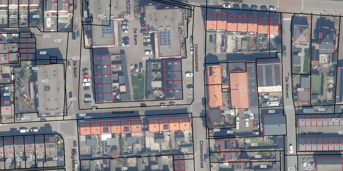 Het perceel waarop Christinastraat 2-B staat heeft een oppervlakte van 3123 m². Dit is een zeer groot perceel. De perceeloppervlakte wordt geregistreerd door het Kadaster. Gedetailleerde informatie over de maten van dit perceel kunt u vinden in het rapport Kadastrale kaart met maatvoering van Christinastraat 2-B.