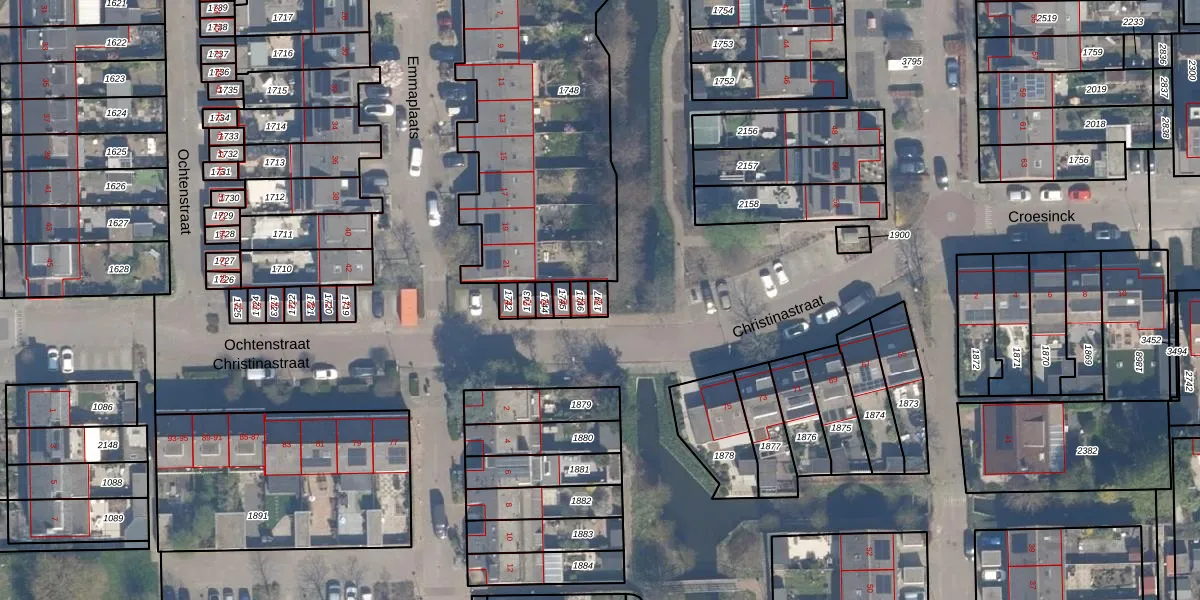 Het perceel waarop Christinastraat 54 staat heeft een oppervlakte van 19 m². Dit is een klein perceel. De perceeloppervlakte wordt geregistreerd door het Kadaster. Gedetailleerde informatie over de maten van dit perceel kunt u vinden in het rapport Kadastrale kaart met maatvoering van Christinastraat 54.