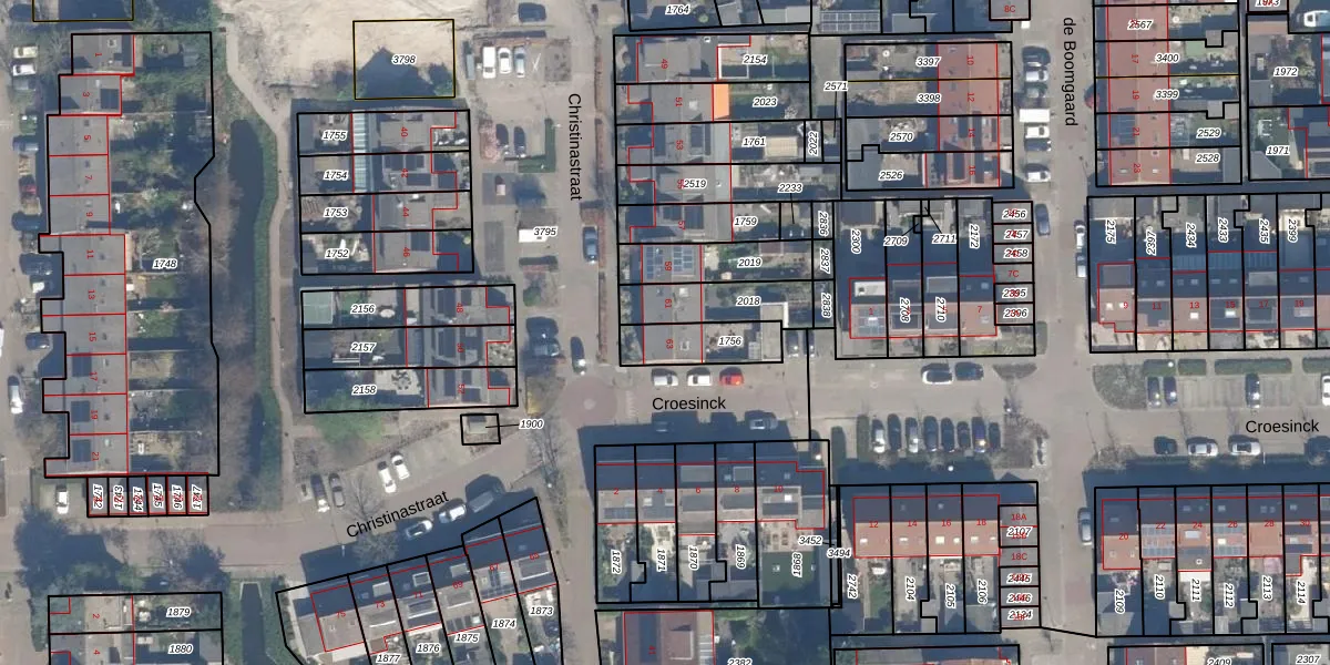 Christinastraat 63 is gelegen op kadastraal perceel BHZ02B1756. Deze kadastrale aanduiding is uniek en wordt gebruikt door het Kadaster om eigendomsrechten en andere zakelijke rechten vast te leggen. Het perceel maakt onderdeel uit van de kadastrale gemeente Benthuizen.