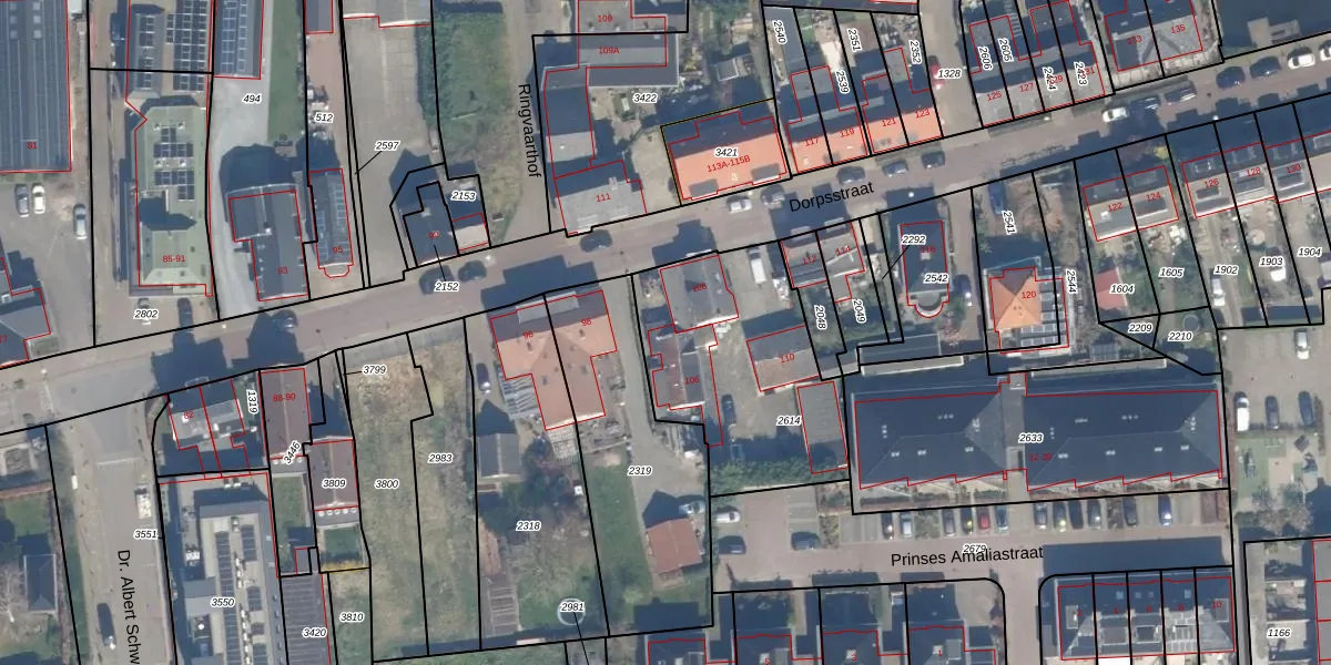 Het perceel waarop Dorpsstraat 106 staat heeft een oppervlakte van 852 m². Dit is een groot perceel. De perceeloppervlakte wordt geregistreerd door het Kadaster. Gedetailleerde informatie over de maten van dit perceel kunt u vinden in het rapport Kadastrale kaart met maatvoering van Dorpsstraat 106.