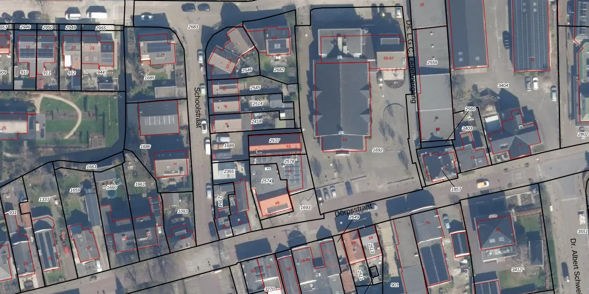 Dorpsstraat 53 is gelegen op kadastraal perceel BHZ02B2577. Deze kadastrale aanduiding is uniek en wordt gebruikt door het Kadaster om eigendomsrechten en andere zakelijke rechten vast te leggen. Het perceel maakt onderdeel uit van de kadastrale gemeente Benthuizen.