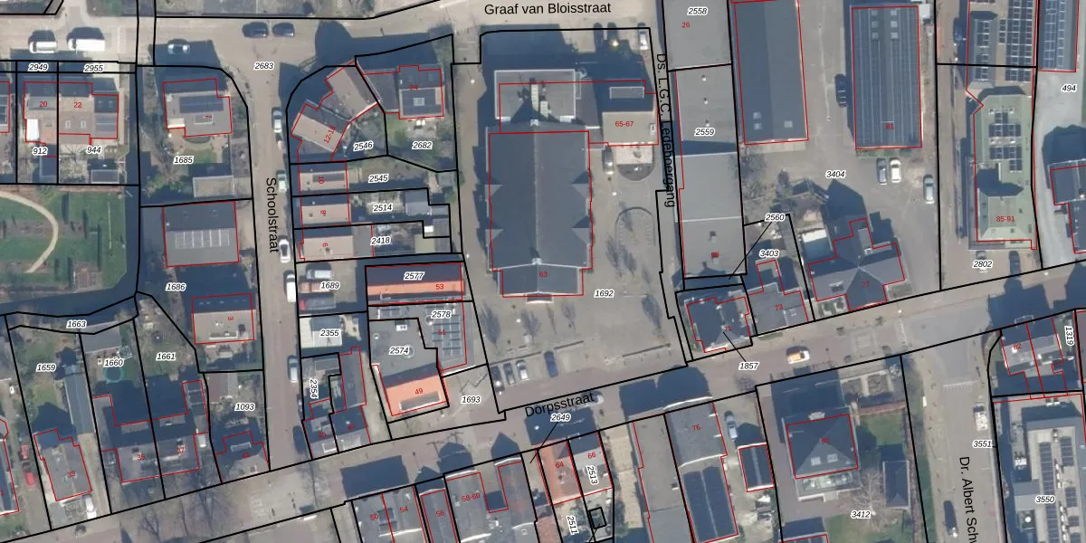 Het perceel waarop Dorpsstraat 63 staat heeft een oppervlakte van 2420 m². Dit is een zeer groot perceel. De perceeloppervlakte wordt geregistreerd door het Kadaster. Gedetailleerde informatie over de maten van dit perceel kunt u vinden in het rapport Kadastrale kaart met maatvoering van Dorpsstraat 63.