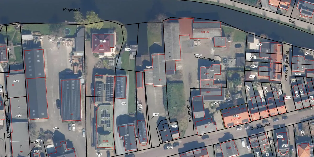 Gebruik de zoekbalk of klik op een perceel voor informatie over de adressen binnen dit perceel.
