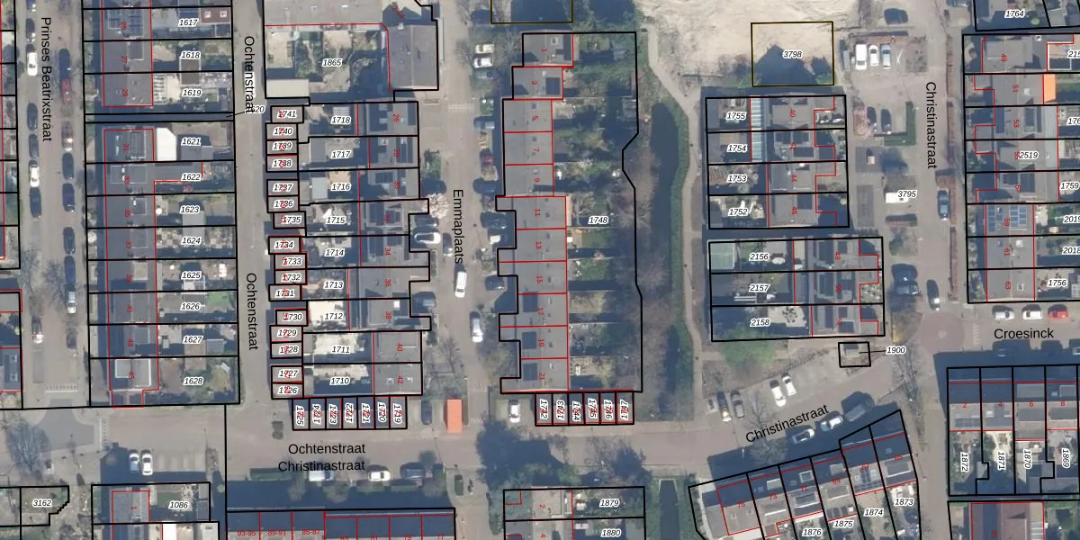 Het perceel waarop Emmaplaats 15 staat heeft een oppervlakte van 1543 m². Dit is een zeer groot perceel. De perceeloppervlakte wordt geregistreerd door het Kadaster. Gedetailleerde informatie over de maten van dit perceel kunt u vinden in het rapport Kadastrale kaart met maatvoering van Emmaplaats 15.