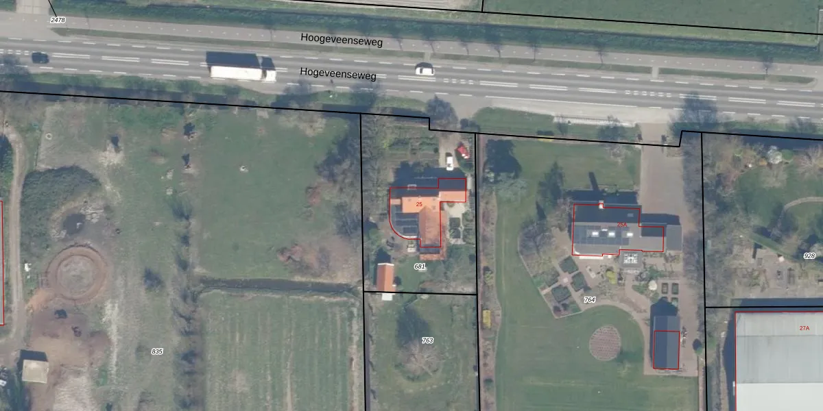 Hogeveenseweg 25 is gelegen op kadastraal perceel BHZ02D681. Deze kadastrale aanduiding is uniek en wordt gebruikt door het Kadaster om eigendomsrechten en andere zakelijke rechten vast te leggen. Het perceel maakt onderdeel uit van de kadastrale gemeente Benthuizen.