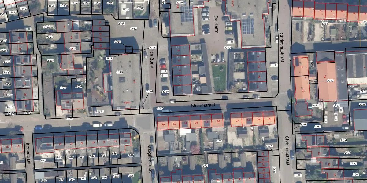 Het perceel waarop Molenstraat 1 staat heeft een oppervlakte van 3123 m². Dit is een zeer groot perceel. De perceeloppervlakte wordt geregistreerd door het Kadaster. Gedetailleerde informatie over de maten van dit perceel kunt u vinden in het rapport Kadastrale kaart met maatvoering van Molenstraat 1.