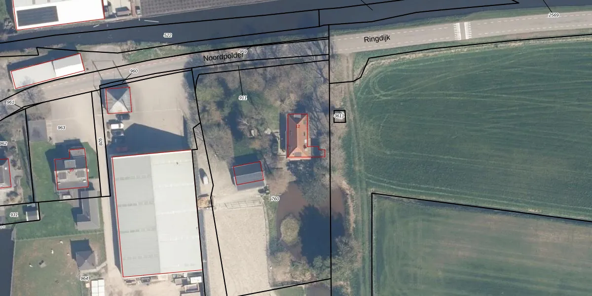 Het perceel waarop Noordpolder 12 staat heeft een oppervlakte van 3205 m². Dit is een zeer groot perceel. De perceeloppervlakte wordt geregistreerd door het Kadaster. Gedetailleerde informatie over de maten van dit perceel kunt u vinden in het rapport Kadastrale kaart met maatvoering van Noordpolder 12.