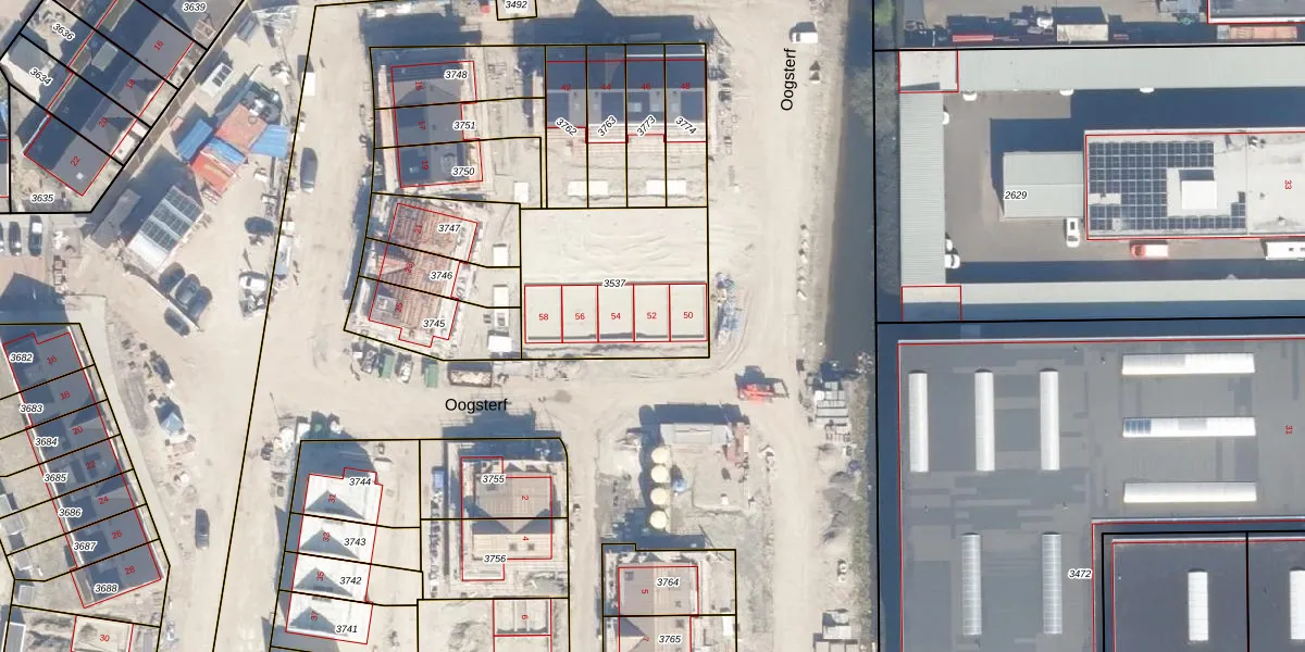 Het perceel waarop Oogsterf 52 staat heeft een oppervlakte van 654 m². Dit is een groot perceel. De perceeloppervlakte wordt geregistreerd door het Kadaster. Gedetailleerde informatie over de maten van dit perceel kunt u vinden in het rapport Kadastrale kaart met maatvoering van Oogsterf 52.