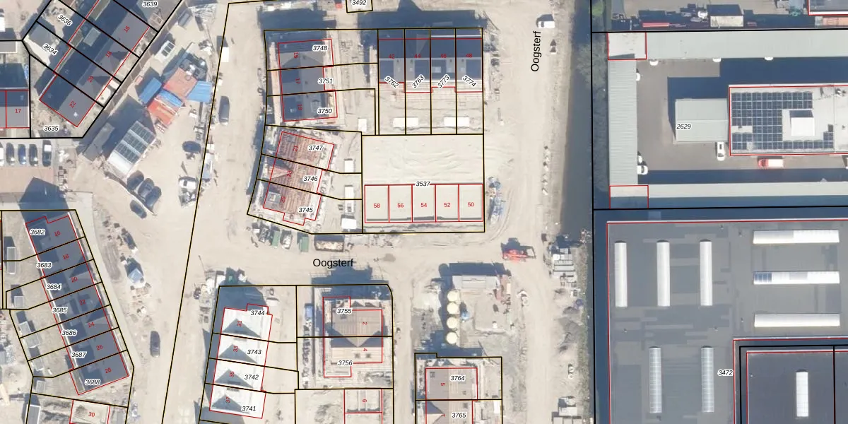 Het perceel waarop Oogsterf 54 staat heeft een oppervlakte van 654 m². Dit is een groot perceel. De perceeloppervlakte wordt geregistreerd door het Kadaster. Gedetailleerde informatie over de maten van dit perceel kunt u vinden in het rapport Kadastrale kaart met maatvoering van Oogsterf 54.