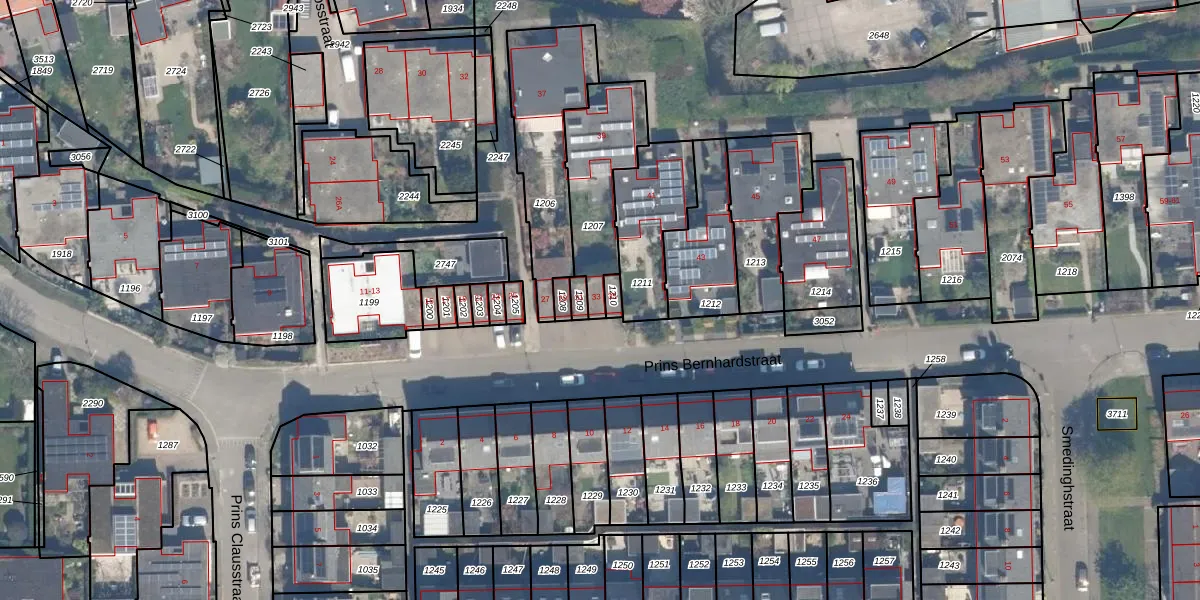 Het perceel waarop Prins Bernhardstraat 33 staat heeft een oppervlakte van 322 m². Dit is een groot perceel. De perceeloppervlakte wordt geregistreerd door het Kadaster. Gedetailleerde informatie over de maten van dit perceel kunt u vinden in het rapport Kadastrale kaart met maatvoering van Prins Bernhardstraat 33.
