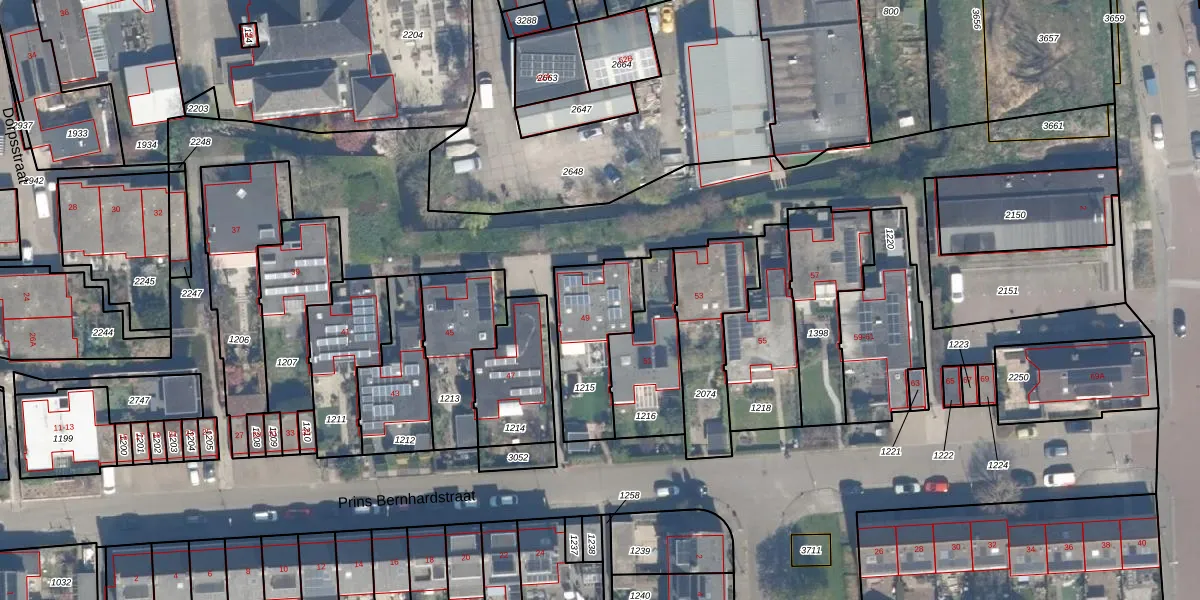 Het perceel waarop Prins Bernhardstraat 49 staat heeft een oppervlakte van 320 m². Dit is een groot perceel. De perceeloppervlakte wordt geregistreerd door het Kadaster. Gedetailleerde informatie over de maten van dit perceel kunt u vinden in het rapport Kadastrale kaart met maatvoering van Prins Bernhardstraat 49.
