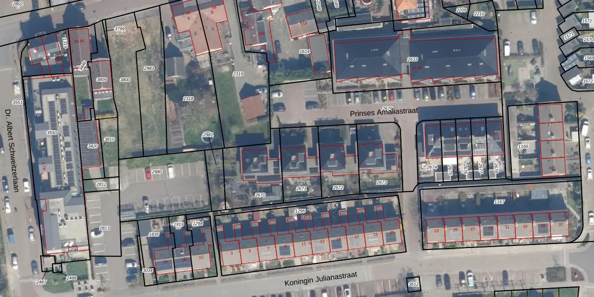 Het perceel waarop Prinses Amaliastraat 5 staat heeft een oppervlakte van 320 m². Dit is een groot perceel. De perceeloppervlakte wordt geregistreerd door het Kadaster. Gedetailleerde informatie over de maten van dit perceel kunt u vinden in het rapport Kadastrale kaart met maatvoering van Prinses Amaliastraat 5.