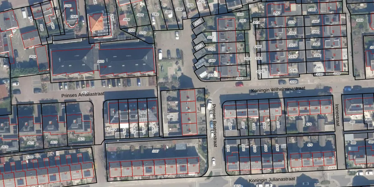 Het perceel waarop Prinses Beatrixstraat 2 staat heeft een oppervlakte van 585 m². Dit is een groot perceel. De perceeloppervlakte wordt geregistreerd door het Kadaster. Gedetailleerde informatie over de maten van dit perceel kunt u vinden in het rapport Kadastrale kaart met maatvoering van Prinses Beatrixstraat 2.