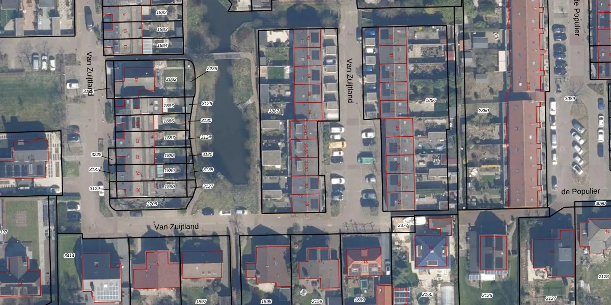 Het perceel waarop Van Zuijtland 36 staat heeft een oppervlakte van 1375 m². Dit is een zeer groot perceel. De perceeloppervlakte wordt geregistreerd door het Kadaster. Gedetailleerde informatie over de maten van dit perceel kunt u vinden in het rapport Kadastrale kaart met maatvoering van Van Zuijtland 36.