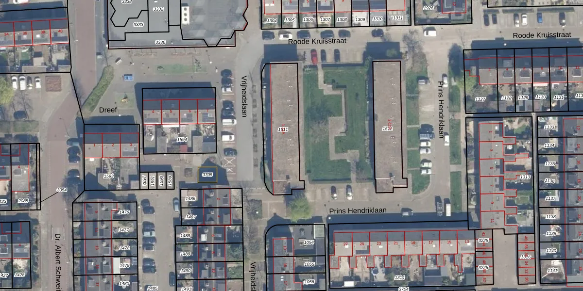 Het perceel waarop Vrijheidslaan 9 staat heeft een oppervlakte van 550 m². Dit is een groot perceel. De perceeloppervlakte wordt geregistreerd door het Kadaster. Gedetailleerde informatie over de maten van dit perceel kunt u vinden in het rapport Kadastrale kaart met maatvoering van Vrijheidslaan 9.