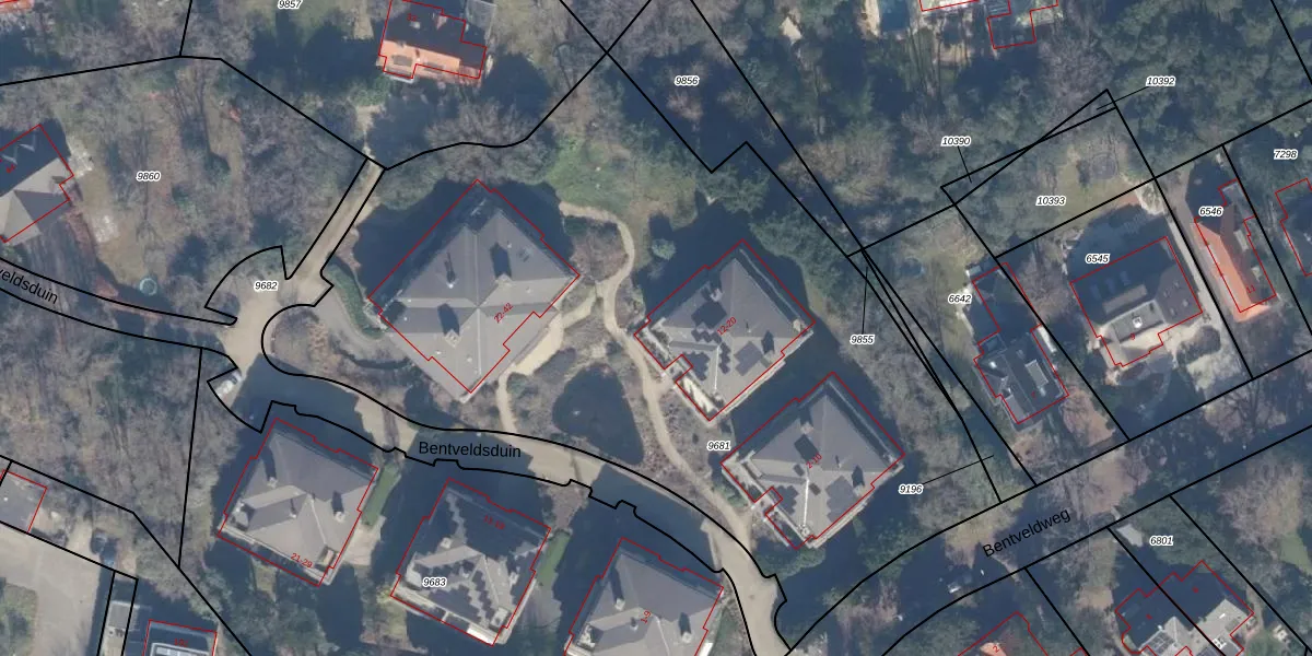 Het perceel waarop Bentveldsduin 12 staat heeft een oppervlakte van 4747 m². Dit is een zeer groot perceel. De perceeloppervlakte wordt geregistreerd door het Kadaster. Gedetailleerde informatie over de maten van dit perceel kunt u vinden in het rapport Kadastrale kaart met maatvoering van Bentveldsduin 12.