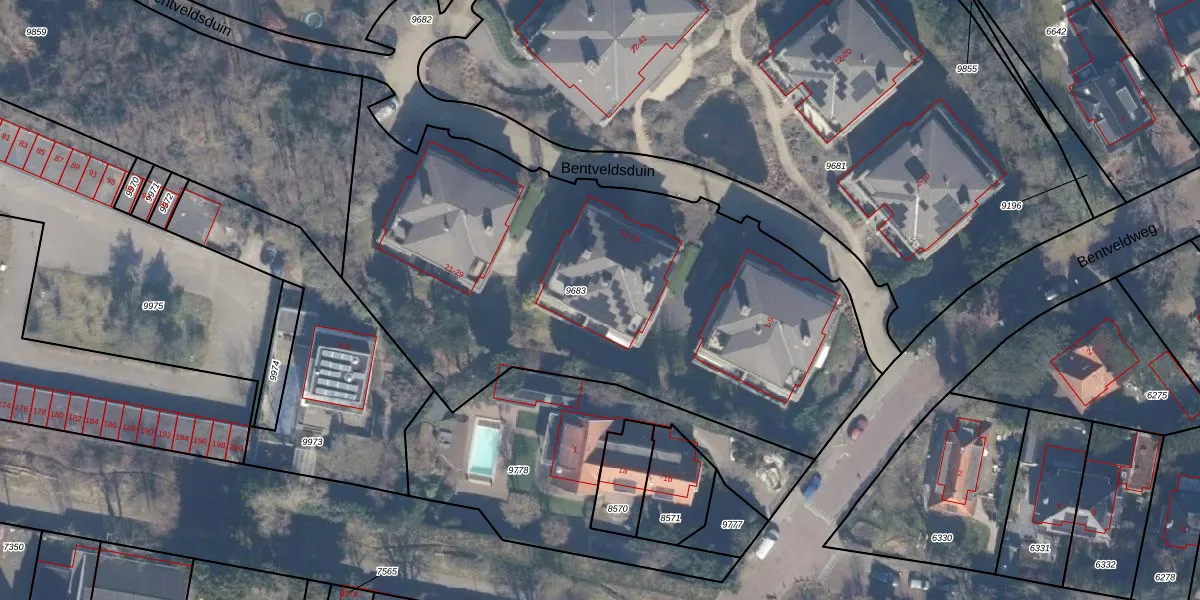 Het perceel waarop Bentveldsduin 19 staat heeft een oppervlakte van 2869 m². Dit is een zeer groot perceel. De perceeloppervlakte wordt geregistreerd door het Kadaster. Gedetailleerde informatie over de maten van dit perceel kunt u vinden in het rapport Kadastrale kaart met maatvoering van Bentveldsduin 19.