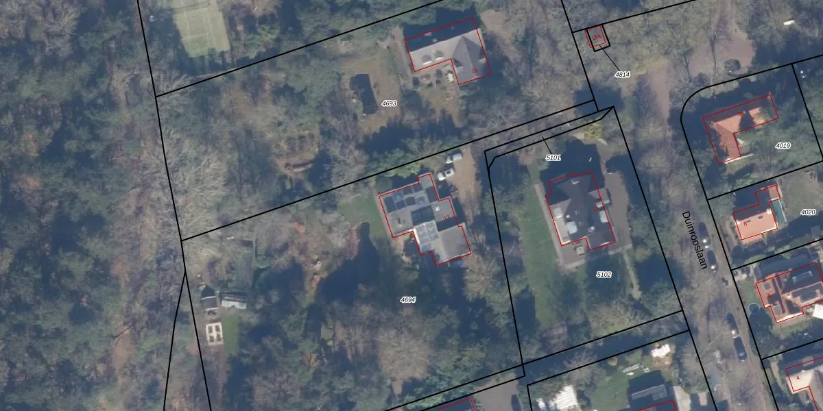 Het perceel waarop Duinrooslaan 13 staat heeft een oppervlakte van 4385 m². Dit is een zeer groot perceel. De perceeloppervlakte wordt geregistreerd door het Kadaster. Gedetailleerde informatie over de maten van dit perceel kunt u vinden in het rapport Kadastrale kaart met maatvoering van Duinrooslaan 13.